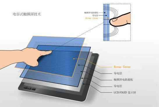 采用电容感应:手指(或其他导电体)与屏幕表面的导电层形成微小耦合电容,控制器检测电容变化并计算坐标。 |